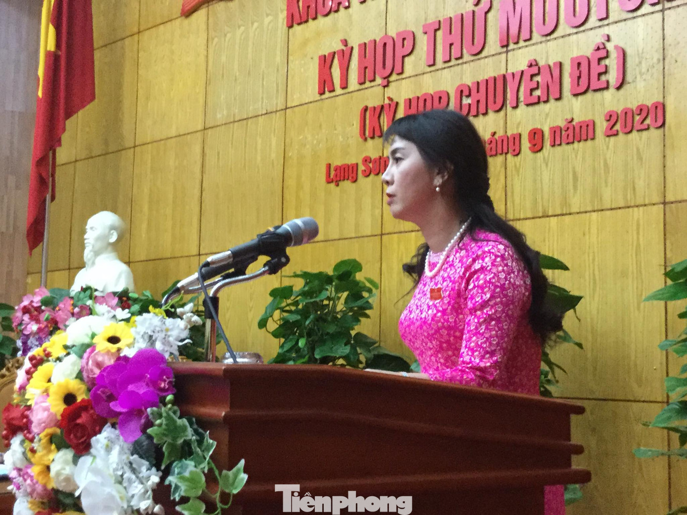 Bà Đoàn Thu Hà, tân Phó chủ tịch UBND tỉnh thay mặt những người vừa trúng cử bày tỏ sự cảm ơn với tín nhiệm của HĐND tỉnh và hứa sẽ nỗ lực, phấn đấu, giành nhiều thành tích to lớn hơn, cùng tập thể ban lãnh đạo tỉnh đưa Lạng Sơn ngày càng giàu đẹp .Ảnh: Duy Chiến
