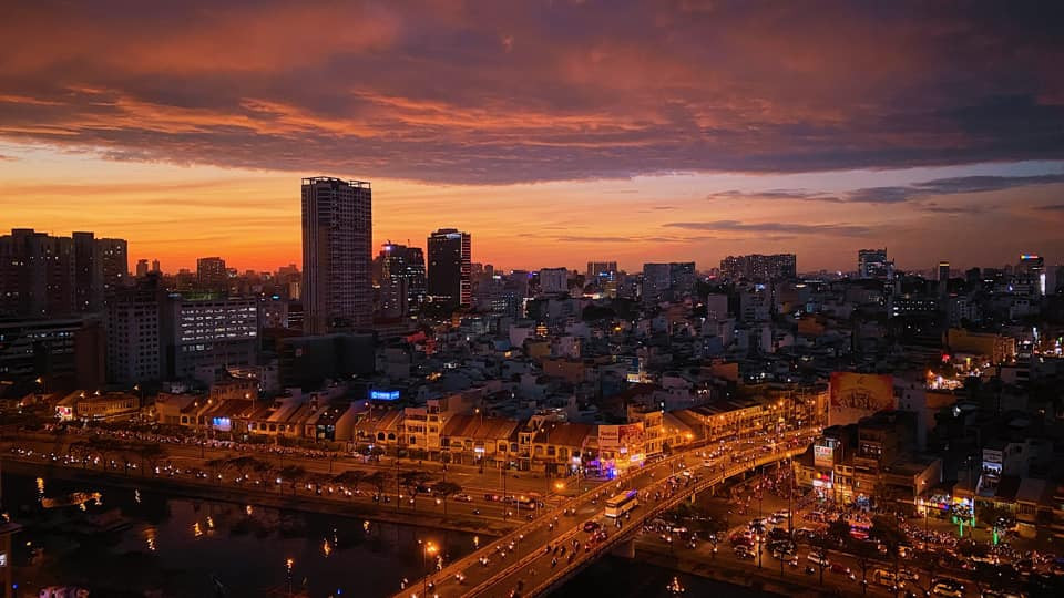 Chiều 21/12, người dân Sài Gòn được chiêm ngưỡng khung cảnh hoàng hôn đẹp đến xao xuyến. Những vệt nắng hồng, cam rải dài trên nền trời, đan vào các tầng mây tạo nên mảng màu sắc vô cùng kì ảo. Sau giờ tan học, tan làm, ngắm nhìn thành phố chìm trong vẻ đẹp đầy mê say ấy, cảm giác bình yên lạ lùng.