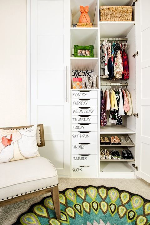 Dán nhãn từng ngăn tủ đựng đồ: Để giúp trẻ thuận tiện trong việc tìm đồ mặc vào buổi sáng, bố mẹ có thể dán nhãn từng ngăn tủ như tủ quần áo dưới đây; trong đó chia cụ thể đồ mặc vào thứ Hai, Ba, Tư…; ngăn đựng tất, đồ lót…