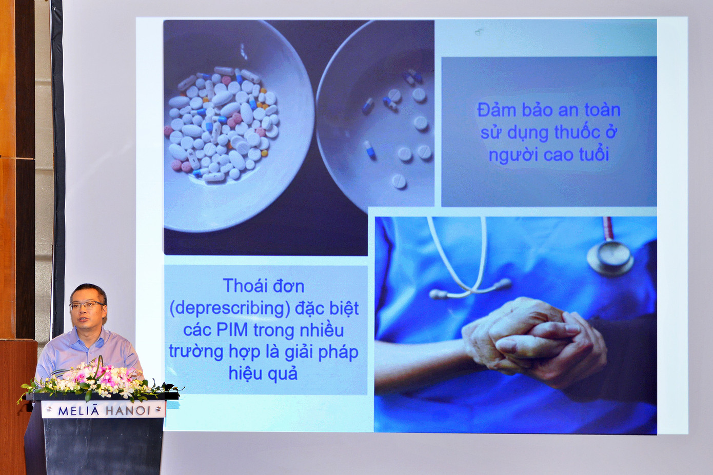 Để đảm bảo chất lượng điều trị và chất lượng cuộc sống cho người bệnh, việc sử dụng thuốc an toàn là vấn đề đang được xã hội, cộng đồng quan tâm. Bên cạnh đó, chúng ta đang đối mặt với sự già hóa dân số ngày càng gia tăng. Đại diện Trung tâm Quốc gia về Thông tin thuốc và Theo dõi phản ứng có hại của thuốc, PGS.TS. Nguyễn Hoàng Anh – Giám đốc đã trình bày trước toàn thể hội nghị về vấn đề đảm bảo an toàn trong sử dụng thuốc cho người cao tuổi. Theo PGS.TS. Nguyễn Hoàng Anh, cùng với xu hướng già hóa dân số toàn cầu, Việt Nam hiện nay có khoảng 5,2 triệu người cao tuổi > 65 tuổi. Tình trạng đa bệnh lý, đa thuốc cùng với việc sử dụng một số nhóm thuốc có khả năng không phù hợp có thể làm tăng nguy cơ biến cố bất lợi khi sử dụng thuốc cho người cao tuổi. Trong bối cảnh này, cần đảm bảo sử dụng thuốc an toàn ở người cao tuổi thông qua việc hạn chế tối đa sử dụng các thuốc không phù hợp, góp phần nâng chất lượng điều trị cũng như giảm chi phí điều trị trong lĩnh vực lão khoa.