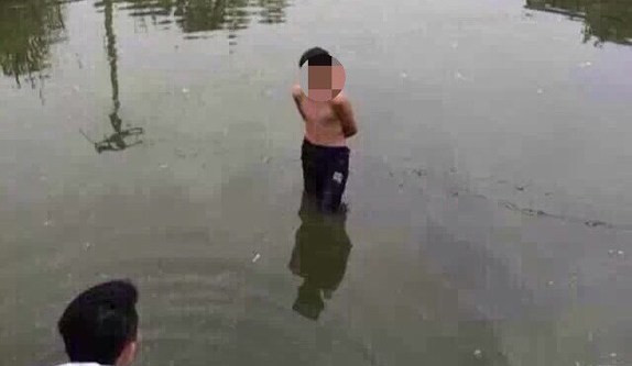 Dường như dân làng cho rằng, sự trừng phạt bằng cách xin lỗi trên là quá nhẹ, họ tiếp tục bắt cậu bé nhốt vào một cũi lợn. Vẫn chưa 'hả dạ', dân làng kéo cậu bé đến bờ hồ, lột trần áo em rồi bắt ngâm mình dưới nước lạnh 10 độ C.