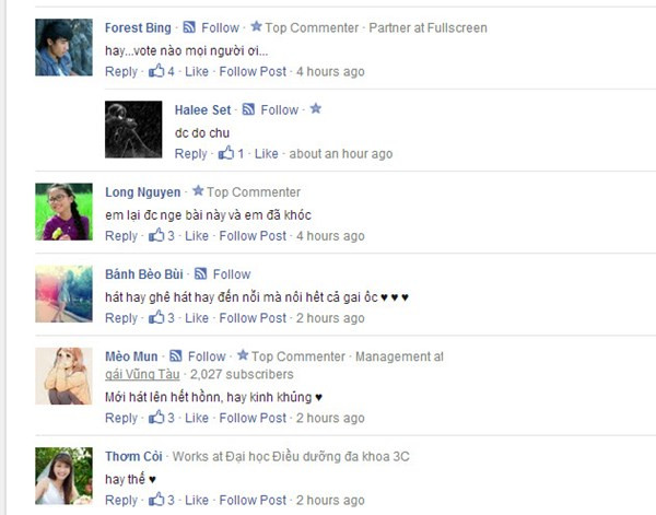 Bạn có nickname Bánh Bèo Bùi nhận xét: “Hát hay ghê. Hát hay đến nỗi mà nổi hết cả gai ốc”.