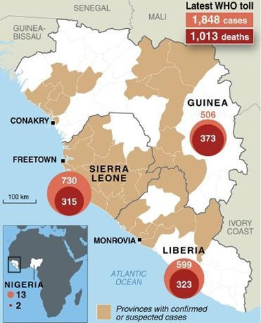 Theo Tổ chức Y tế Thế giới WHO, hơn 1.000 người ở Tây Phi thiệt mạng do virus Ebola tính từ đầu năm nay, trong đó, chỉ riêng ở Libera đã xác định khoảng 599 trường hợp nhiễm bệnh với 323 ca tử vong.