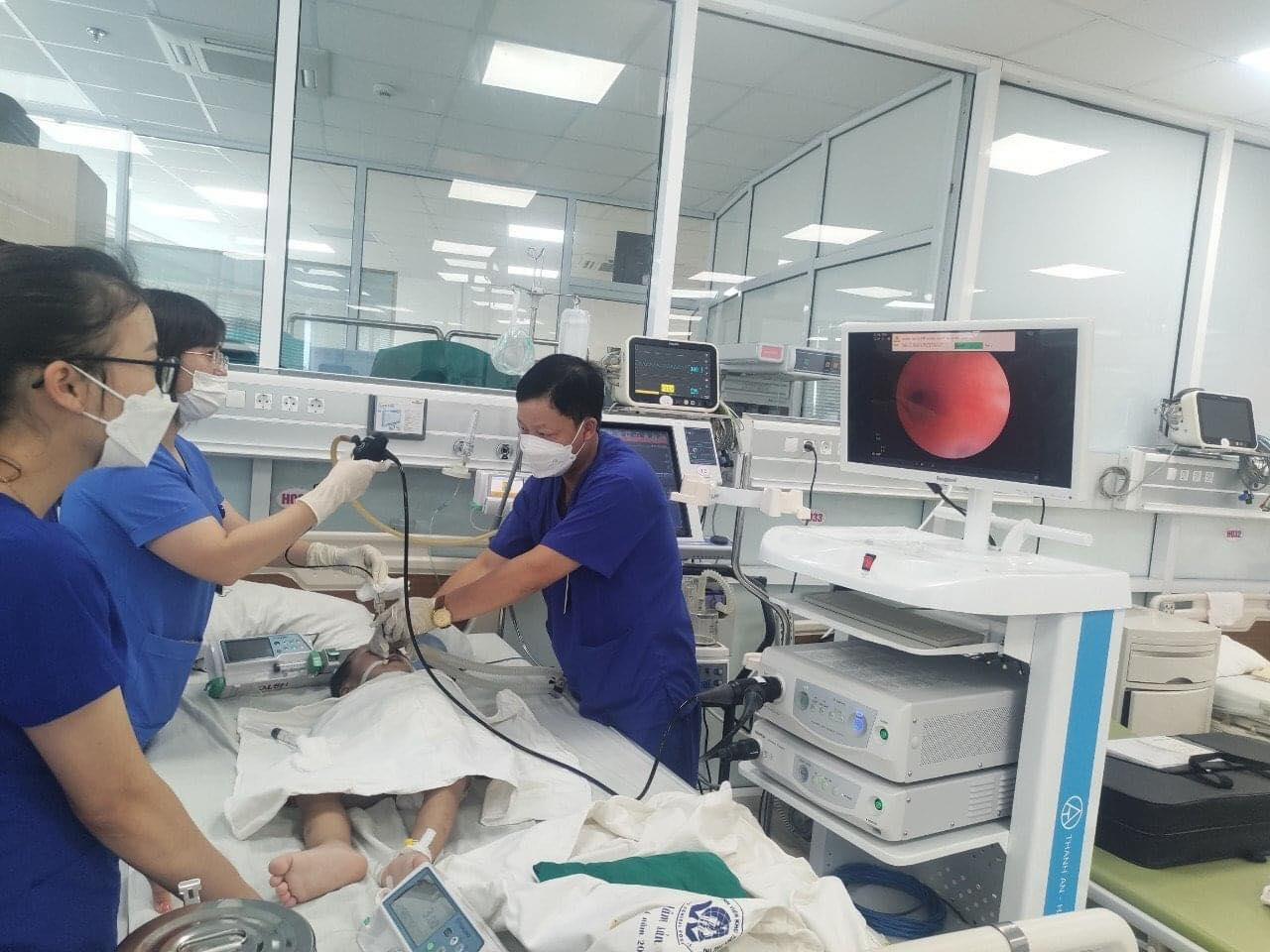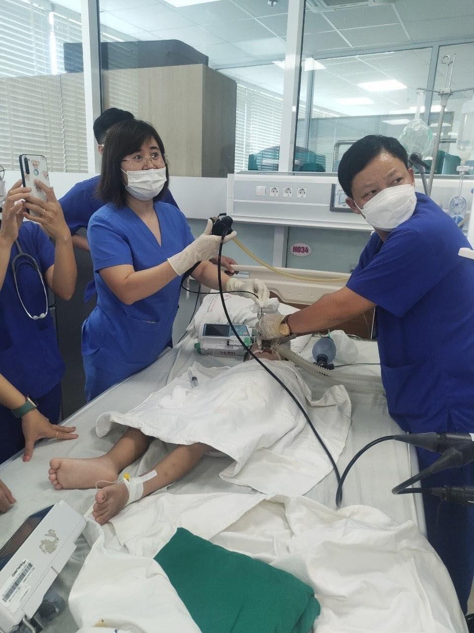 Khai thác từ gia đình, trẻ không có tiền sử bệnh lý, sau khi loại trừ các trường hợp có thể xảy ra, các Bác sỹ khoa Hồi sức tích cực – chống độc của bệnh viện lập tức nghĩ tới dị vật đường thở. Trẻ được chỉ định chụp CT lồng ngực. Hình ảnh chụp cho thấy trẻ bị tắc phế quản gốc bên phải. Ngay lập tức trẻ được đặt ống nội khí quản lại và tiến hành nội soi phế quản ngay tại giường, gắp ra được dị vật có kích thước 0.3*1cm, nghi giống miếng thịt tôm. Hiện tại thông khí đã ổn, trẻ được rút máy và có thể tự thở.