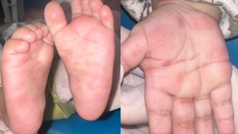 Sau khi tiêm mũi cuối 1 ngày, mẹ bệnh nhi có dấu hiệu chuyển dạ và sinh con ở tuần 36. Cân nặng của bệnh nhi khi sinh là 2,3 kg và không có biểu hiện bất thường. Bệnh nhi chưa được làm xét nghiệm sàng lọc giang mai sơ sinh.