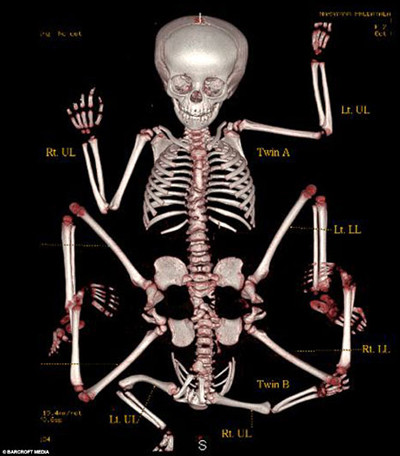 Bé gái Lakshmi Tatma bị dính với người chị em “ký sinh”, không có đầu, ở phần xương chậu. Người chị em “ký sinh” cũng có xương sống và thận riêng.