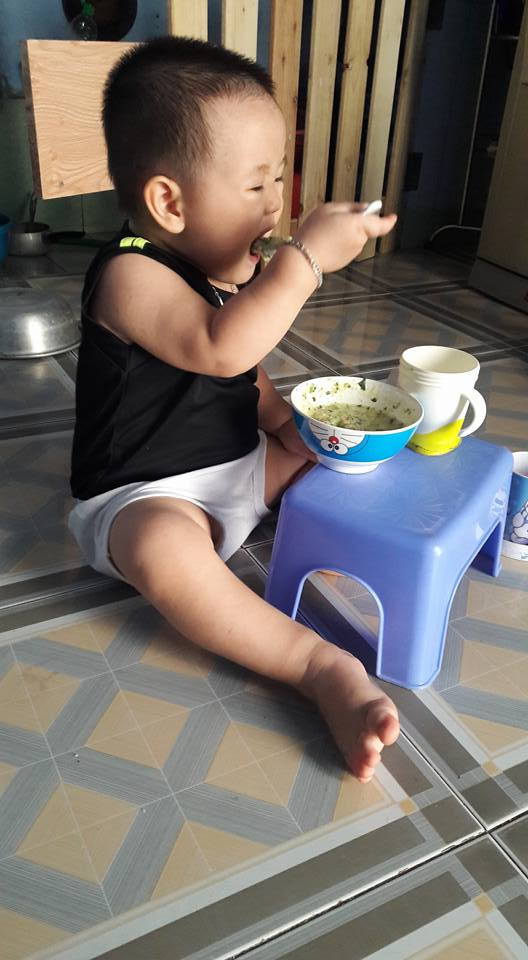 Bé Xì Trum tự giác xúc cháo trong các bữa ăn.