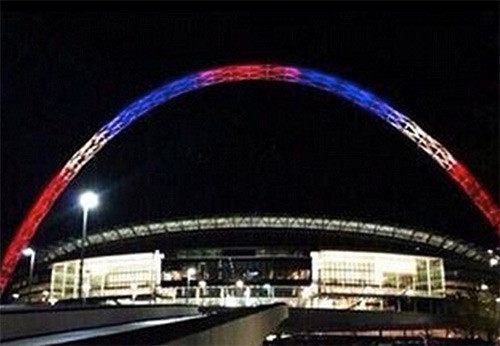 Rio Ferdinand đăng một bức hình chụp mái vòm sân vận động Wembley nổi tiếng của nước Anh nhưng sáng lên cùng màu quốc kỳ Pháp (đỏ, trắng và xanh).