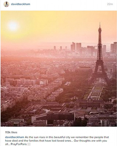 Beckham đã có mười lần ra sân thi đấu cho CLB Paris Saint-Germain hồi năm 2013 trước khi anh chấm dứt sự nghiệp cầu thủ. Cựu tiền vệ tuyển Anh đã đăng tải lên Instagram một bức ảnh chụp cảnh bầu trời Paris vào sáng thứ bảy, kèm dòng chia sẻ: "Khi mặt trời mọc ở thành phố xinh đẹp này, chúng ta nhớ về những người đã chết và các gia đình đã mất đi những người thân yêu... Cầu nguyện cho Paris”.