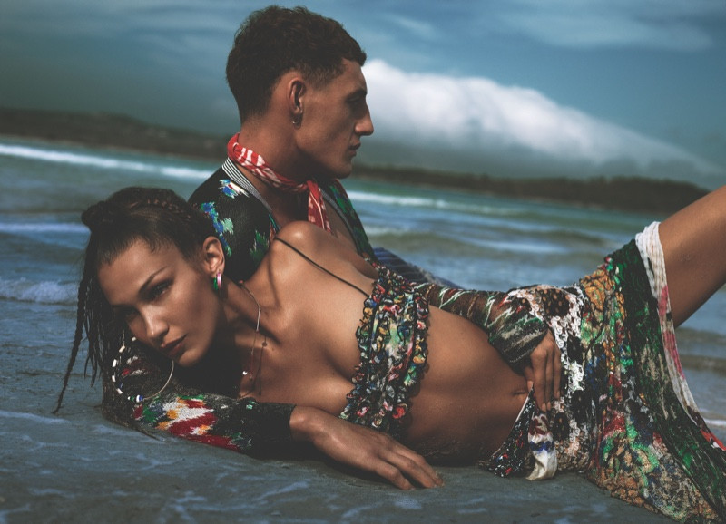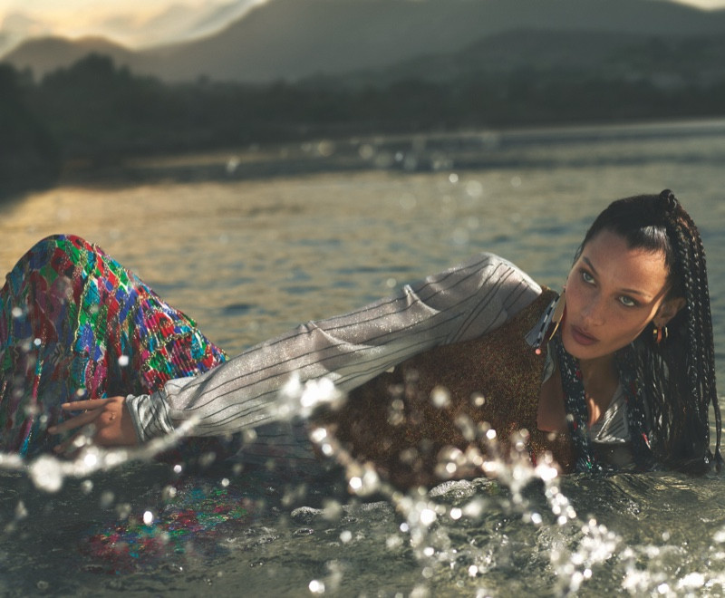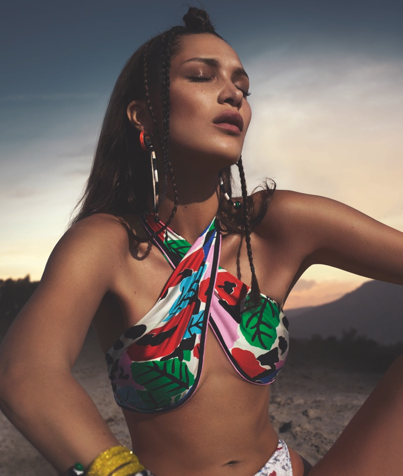 Bella Hadid tạo dáng khiêu khích trên biển Sardinia nước Ý trong chiến dịch quảng cáo của Missoni xuân hè 2020.