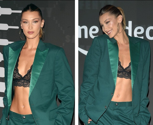 Bella Hadid diện bộ suit màu xanh đậm, lấp ló nội y ren đen mỏng tang.