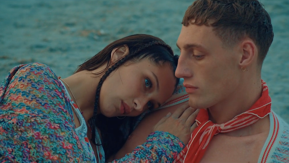Bella Hadid ngả đầu bên vai mẫu nam Aubrey O’Mahoney trong loạt ảnh chụp tại biển Sardinia, cho chiến dịch xuân hè 2020 của Missoni.