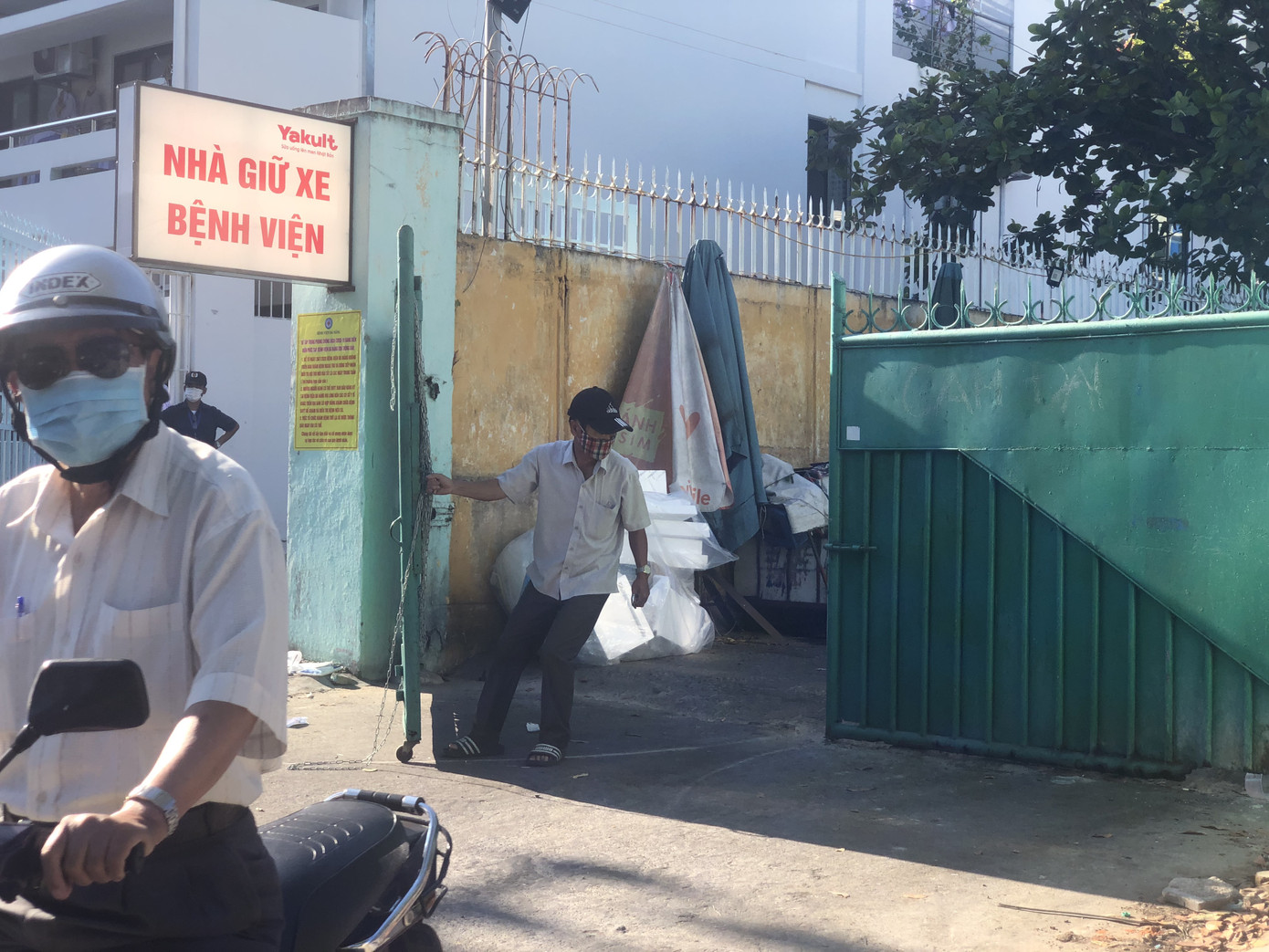Hiện tại, cổng chính của bệnh viện Đà Nẵng có sự hỗ trợ của các chiến sĩ công an trong việc giữ gìn trật tự. Khu vực giữ xe bệnh viện hạn chế đi lại, chỉ đóng mở cổng khi cần thiết. Ảnh: Quyên Javi.