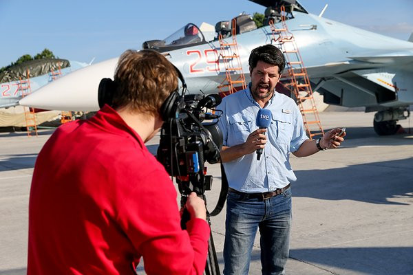 Một phóng viên quốc tế đang ghi hình từ căn cứ không quân Hmeymim.