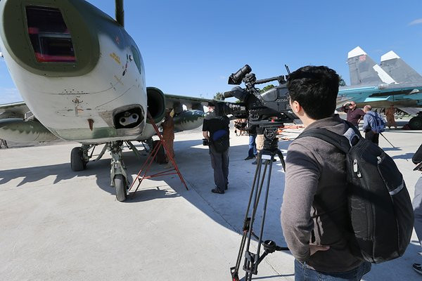 Các phóng viên tác nghiệp trên đường băng của căn cứ không quân Hmeymim.
