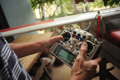 Ông Hạnh tự chế tạo gần như tất cả các công đoạn của máy bay. Trong ảnh ông đang dùng bộ điều khiển vô tuyến thử các chi tiết hoạt động