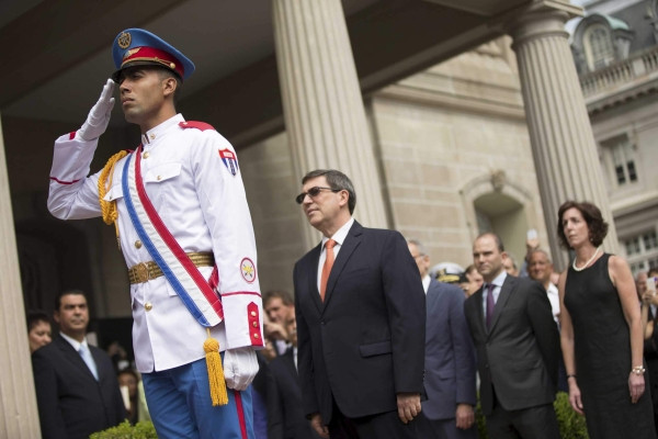 Một thành viên của quân cảnh vệ Cuba giơ tay chào khi Bộ trưởng Bộ Ngoại giao Bruno Rodriguez chuẩn bị cho lễ kéo Quốc kỳ. Ảnh: Andrew Harnik-Pool/Reuters/Time.
