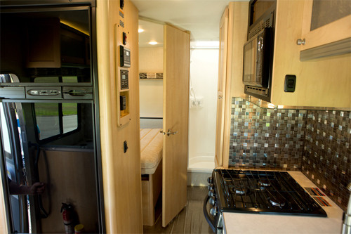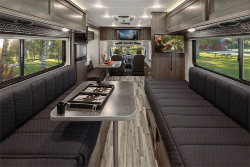 Thiết kế không gian sống khá ấn tượng với tông màu trầm hoặc sáng với các bề mặt ốp gỗ hoặc bọc da. Trang thiết bị như tủ lạnh, bếp nấu, lò vi sóng, tivi, điều hòa... Cửa sổ dọc hai bên thân xe mang lại góc quan sát rộng ra bên ngoài.