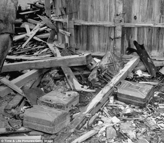 Những thùng đựng xăng mà lính Đức Quốc xã dùng để thiêu thi thể trùm phát xít cùng tình nhân Eva nằm lẫn trong đống đổ nát bên ngoài hầm. Trước khi tự sát vào ngày 30/4/1945, Hitler đã ra lệnh cho cấp dưới mang thi thể của y và bạn gái ra ngoài để hỏa thiêu.