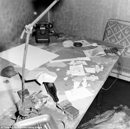 Giấy tờ và nhiều vật dụng ngổn ngang trên bàn gần ghế sofa bị cháy. Hai tuần sau khi Hitler tự sát, nhiếp ảnh gia William Vandivert là nhà báo đầu tiên được vào căn hầm.