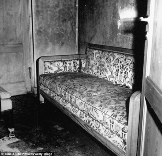 Chiếc ghế sofa còn vết máu và vết cháy dở trong căn hầm bí mật. Đây cũng là nơi trùm phát xít và tình nhân trẻ Eva Braun sống nhiều tháng trước khi quân đội Đức Quốc xã hoàn toàn thất bại.