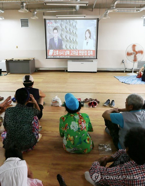 Đài truyền hình đưa tin về cuộc đàm phán giữa quan chức hai nước hôm 22/8. Cảnh tượng diễn ra trong một hầm ở Yeonpyeong - đảo gần biên giới trên biển với Triều Tiên. Giới chức hai bên đã gặp gỡ tại làng Bàn Môn Điếm hôm 22/8 trong khu phi quân sự để giảm căng thẳng trong bối cảnh Bình Nhưỡng ra tối hậu thư để Seoul ngừng chương trình tuyên truyền chống Triều Tiên trên hệ thống loa phóng thanh. Ảnh: Yonhap.