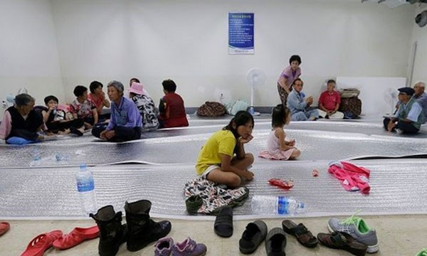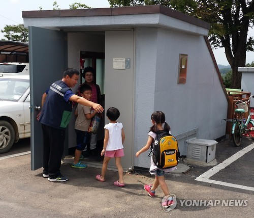Trẻ em tại thành phố Paju, tỉnh Gyeonggi, Hàn Quốc tới nơi sơ tán hôm 22/8, trước hạn chót của tối hậu thư (17h ngày 22/8) mà chính quyền Triều Tiên đưa ra. Ảnh: Yonhap.