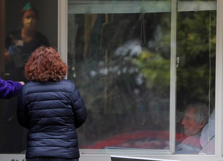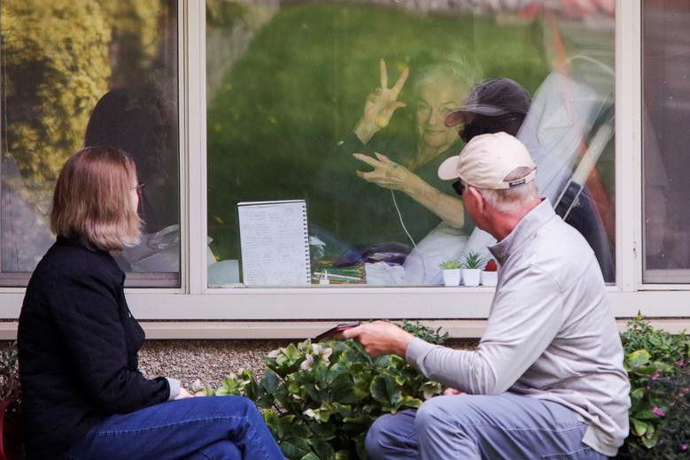 Gene Campbell nói chuyện qua cửa sổ với vợ - bà Dorothy Campbell - tại trung tâm dưỡng lão Kirkland ngày 5/3.