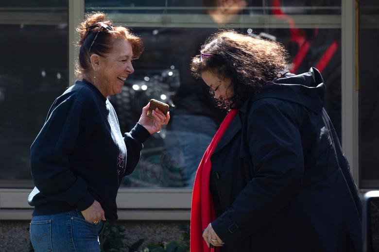 Bà Judie Shape (81 tuổi) vẫy chào phóng viên khi đang trò chuyện qua cửa kính cùng con gái Lori Spencer và con rể Michael Spencer ngày 17/3.