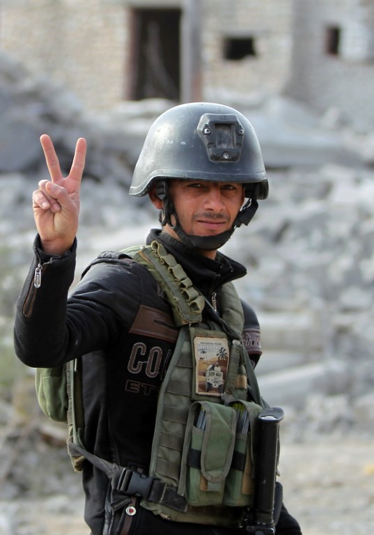 Một binh sỹ của cơ quan chống khủng bố tinh nhuệ của Iraq giơ tay hình chữ V, biểu tượng của chiến thắng, tại Ramadi. Hôm 27/12, IS đã bỏ chạy khỏi hang ổ cuối cùng của chúng tại đây, mang lại chiến thắng vang dội nhất cho lực lượng chính phủ kể từ khi IS chiếm 1/3 lãnh thổ nước này hồi năm 2014.