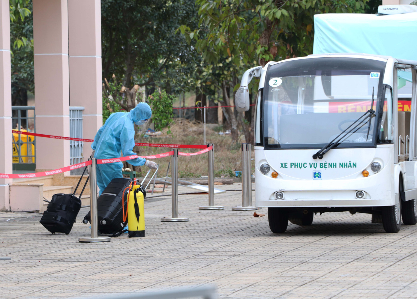 Trước khi xuất viện, hành lý của các bệnh nhân được nhân viên y tế xịt sát khuẩn để đảm bảo an toàn.