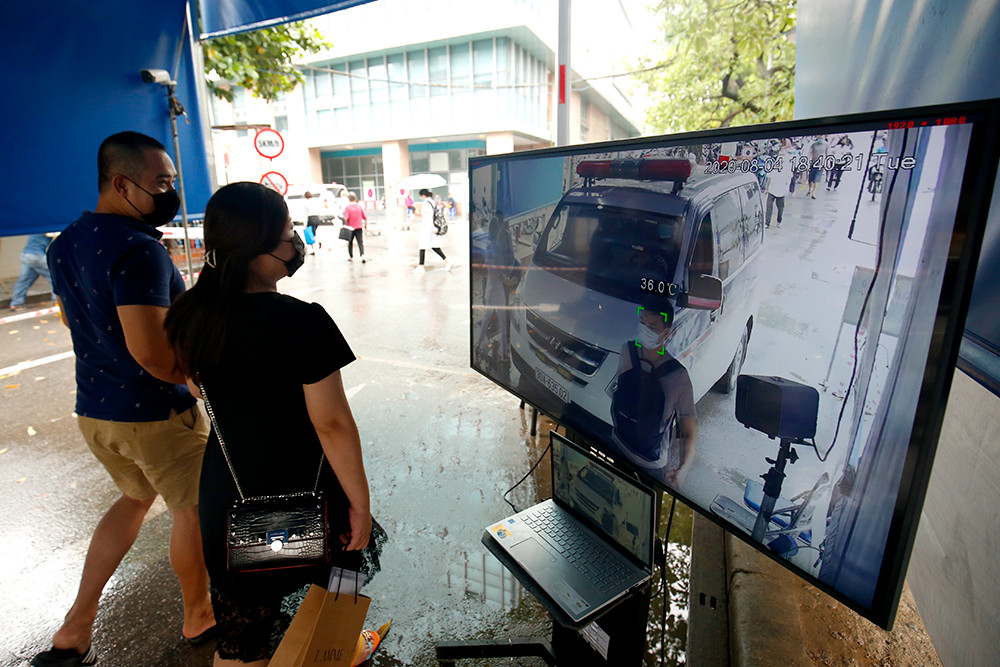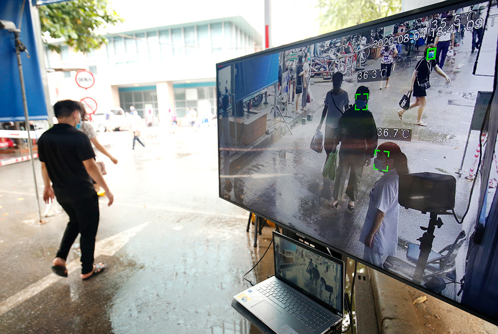 Màn hình cỡ lớn được đặt bên cạnh và có camera ghi hình thân nhiệt  đo chỉ số nhiệt độ từng người đi qua cổng bệnh viện