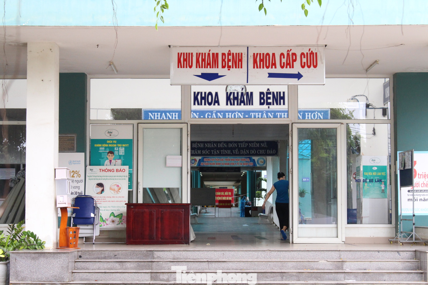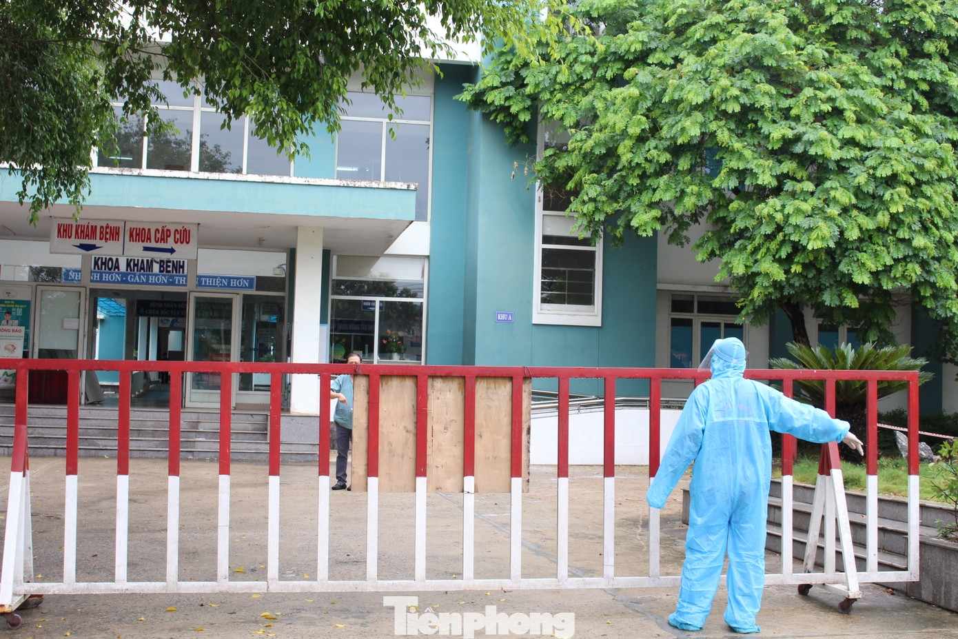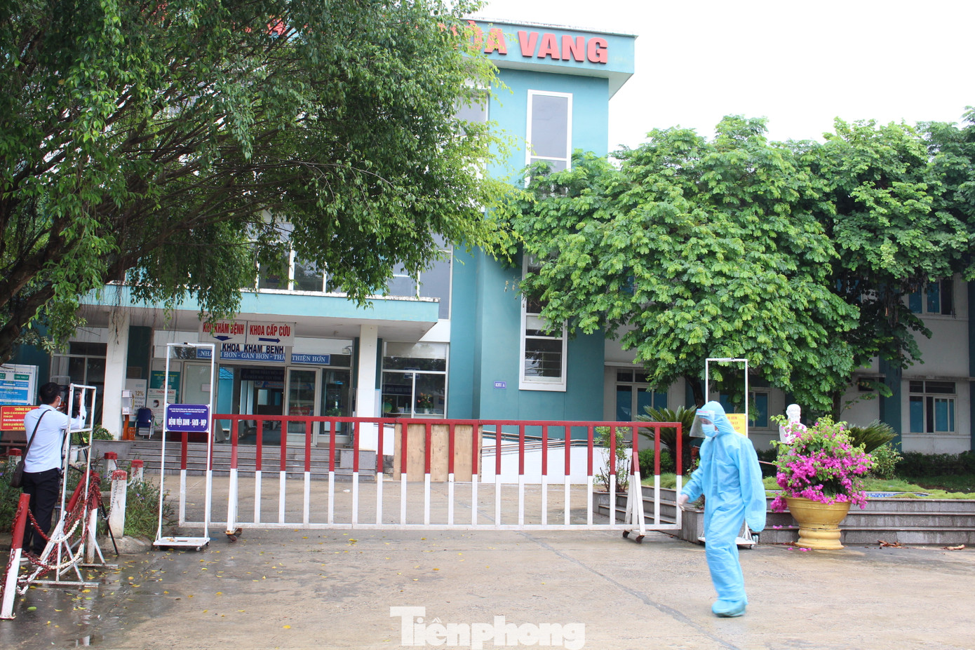 Khu điều trị COVID - 19 được bố trí nằm tách biệt ở tòa nhà phía sau của bệnh viện. Phía trước khu điều trị COVID - 19 có giăng dây phong tỏa và bố trí nhân viên túc trực. Ảnh: Giang Thanh