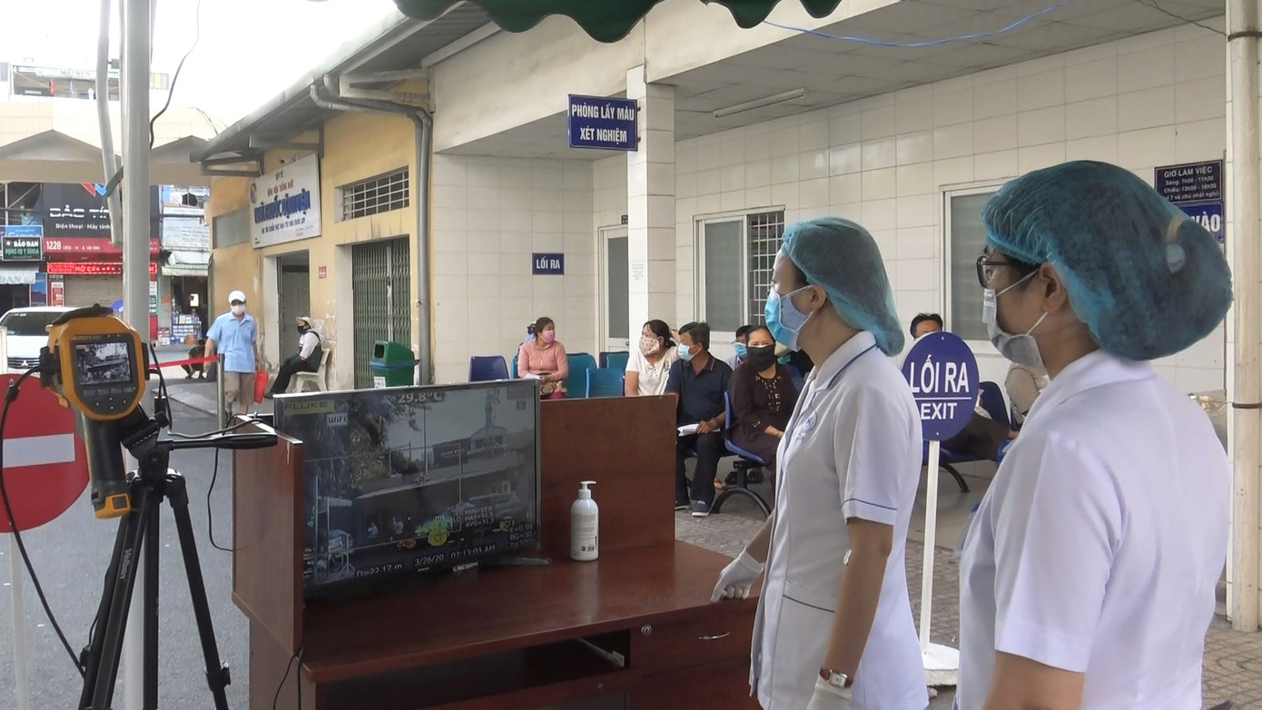 Khi người dân đến khám bệnh sẽ đi qua khu vực đo thân nhiệt trước khi vào trong làm các thủ tục khám chữa bệnh.