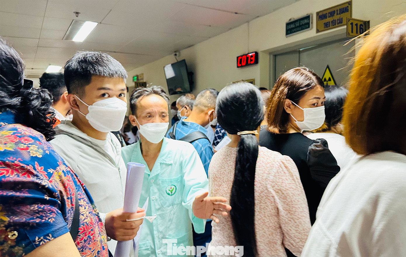 | Trước cửa phòng chụp X-quang bệnh nhân chen chân đứng chờ xếp hàng đến lượt chụp. |