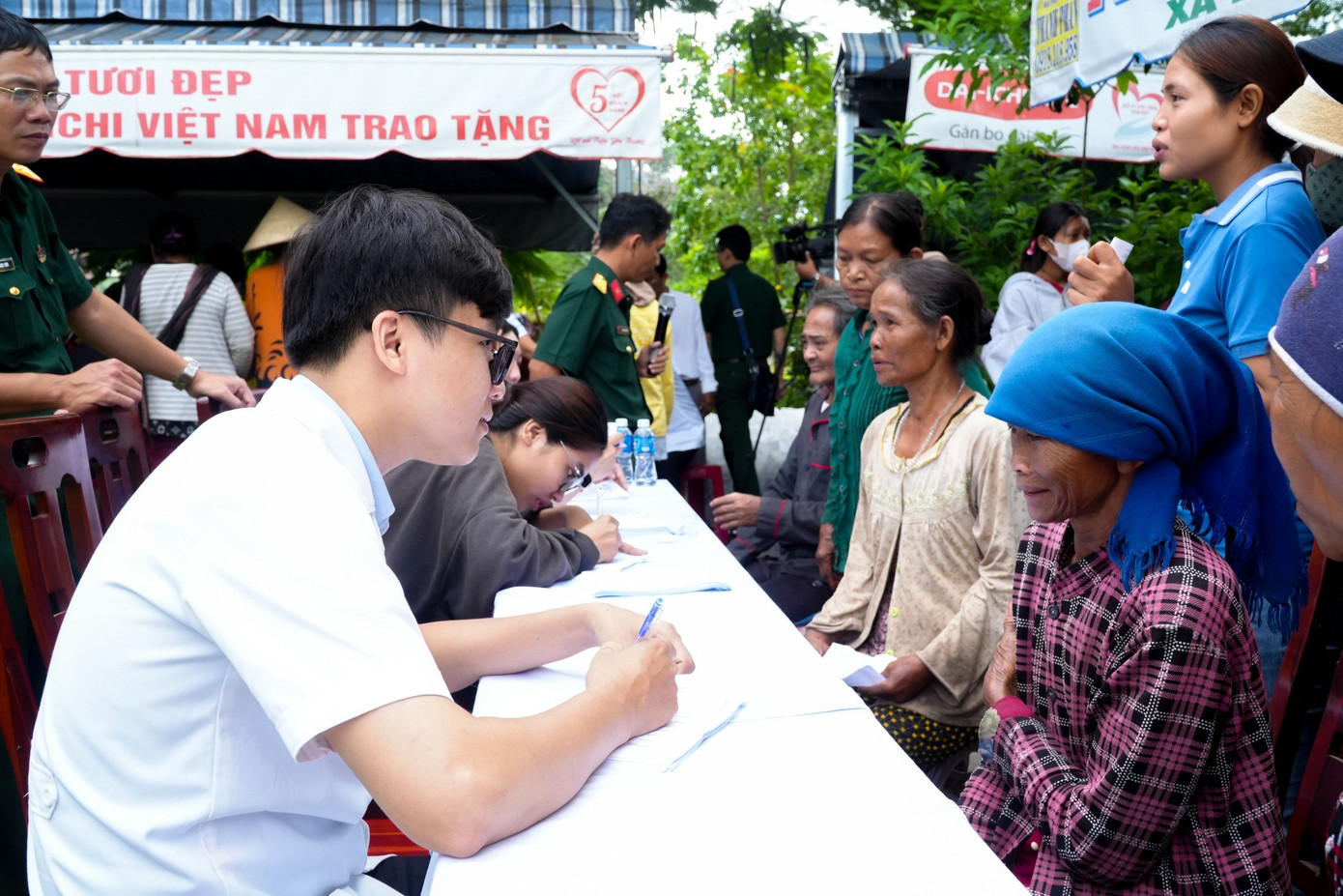| Nhân viên y tế Bệnh viện Quân y 175 khám, phát thuốc cho người dân tại địa phương. |