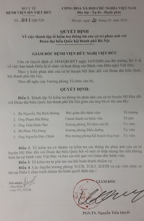 Tổ kiểm tra thông tin do bà Nguyễn Thị Bích Hường, Phó Giám đốc Bệnh viện làm tổ trưởng. Ông Phạm Hải Bằng, Chánh Thanh tra bệnh viện làm tổ phó và 3 ủy viên là trưởng, phó các phòng liên quan.
