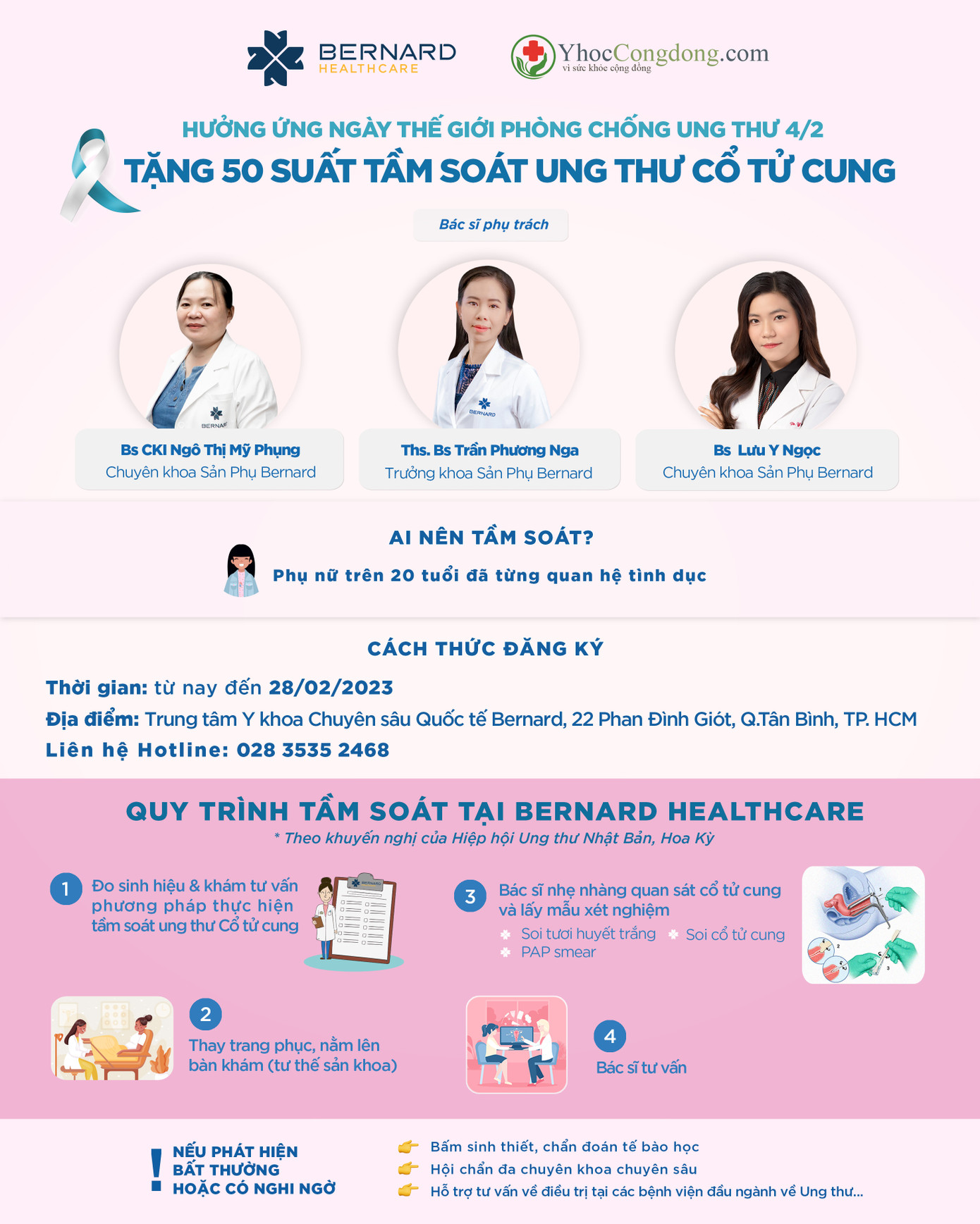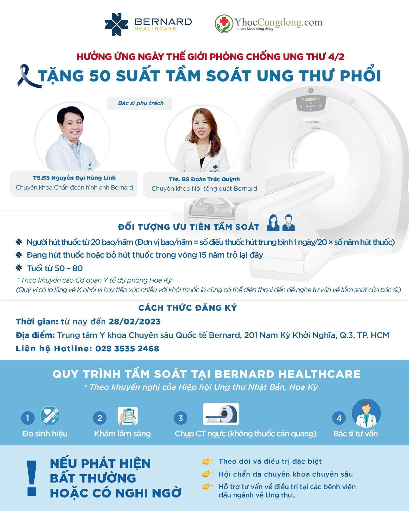 Thông tin chi tiết và cách đăng ký Tầm soát Ung thư Phổi (50 suất) & Ung thư Cổ tử cung (50 suất) tại Bernard Healthcare trong tháng 2 này, tìm hiểu tại đây.