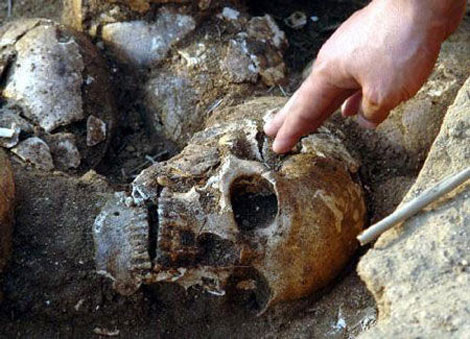 Tại tầng 2 của ngôi mộ, Phó đội trưởng đội khảo cổ Điền Á Kỳ phát hiện một cái đầu lâu, miệng há rất lớn, có lẽ lúc chết rất kinh hoàng. Ngay tối hôm ấy các nhân viên khảo cổ phát hiện 20 bộ hài cốt không còn nguyên vẹn, không quan không quách, đầu một nơi mình một ngả.