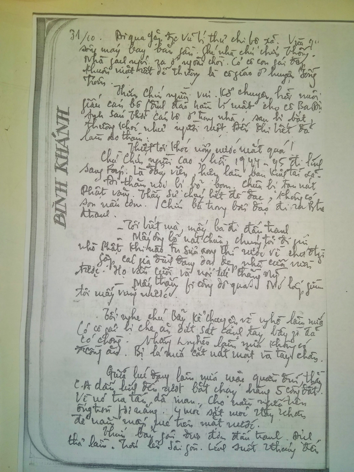 “Ngày 6/12/1966. Làm bài thơ “Chào Đông Xuân” để kịp đăng báo. Tối gác, khoảng 4 giờ sáng B52 dập. Ngày 14/12/1966 Nghe tin giặc oanh tạc vào nội thành Hà Nội. H (tức Hiến, tên thật của nhà văn Lê Anh Xuân - PV) xúc động quá. Căm thù giặc Mỹ nghẹn cả cổ. Không biết ba má và mấy em, XL (Xuân Lan) có sao không? H lo quá”.