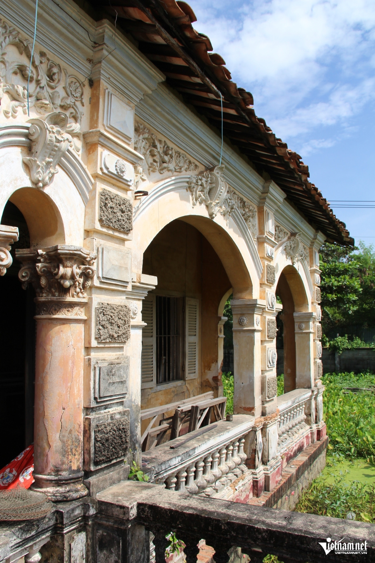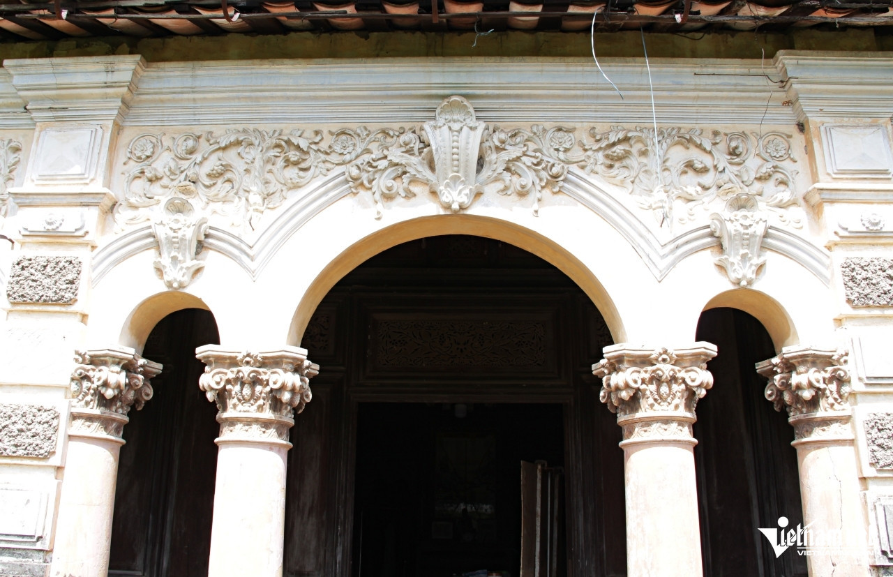 | Phía trước, ngôi nhà có bức tường với hệ thống cột, cửa vòm được trang trí bằng các họa tiết đắp nổi. Ảnh: Hà Nguyễn |