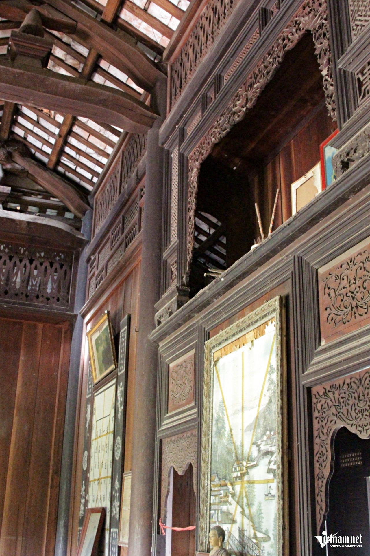 Căn nhà được ngăn đôi bởi vách gỗ chạm lộng, cẩn xà cừ lấp lánh. Trước và trên bức vách này, gia đình ông Luận đặt các ban thờ Phật và cụ Giác. Phía sau vách có bàn thờ vợ của cụ Giác.