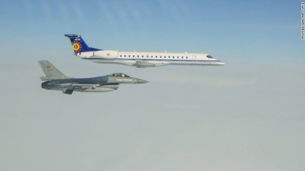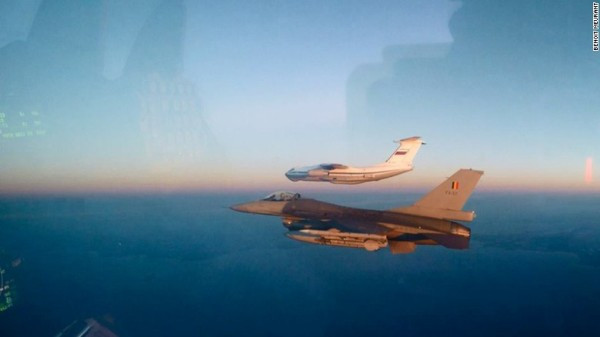 Máy bay An-12PPS của Nga có bạn đồng hành là F-16 của Bỉ.