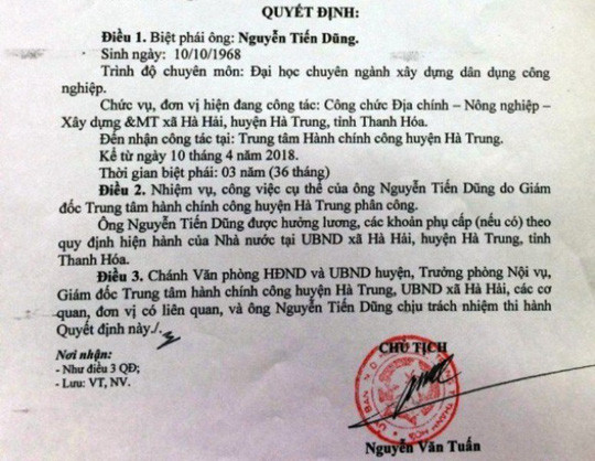Quyết định số 1324/QĐ-UBND ngày 10-4, do ông Nguyễn Văn Tuấn, Chủ tịch UBND huyện Hà Trung, ký nêu rõ: Căn cứ Luật tổ chức chính quyền địa phương năm 2015; căn cứ Luật cán bộ, công chức năm 2008… và xét đề nghị của Trưởng phòng Nội vụ và Giám đốc Trung tâm hành chính công, Chủ tịch UBND huyện Hà Trung đã quyết định "biệt phái" ông Nguyễn Tiến Dũng về công tác tại Trung tâm hành chính công huyện Hà Trung.