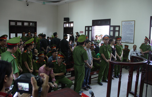 Khi xe thùng vào tòa, nhiều người gào khóc nức nở lao đến gọi tên các bị cáo khiến sân tòa nhốn nháo. Sáng nay, trước lúc HĐXX đọc bản án, bị cáo Nguyễn Ngọc Hưng lao đầu về phía bức tường trong phòng xét xử định tự sát. Người này sau đó được cảnh sát kịp thời ngăn cản, khống chế. Đề phòng tình huống xấu, lực lượng hỗ trợ tư pháp sau đó phân công cán bộ giám sát chặt chẽ các bị cáo.