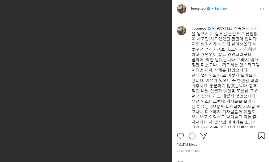 | Mina cho biết bản thân đang sửa thói quen xấu mà ChoA nhắc tới, khẳng định sẽ không đăng lên Instagram nhưng rồi sau khi Jimin đã đăng lời xin lỗi, Mina đã đáp trả bằng một bài đăng khác và quyết định tự sát |