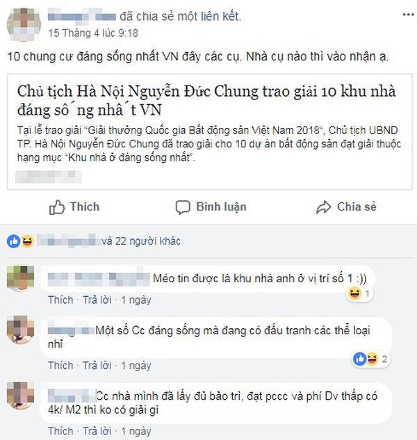 "Không thể tin được khu nhà mình nằm trong top đáng sống, khu nhà ở đáng sống nhất, tốt nhất Hà Nội"; "Một chung cư đáng sống mà đang có đấu tranh các thể loại nhỉ"; "Chung cư nhà mình đã lấy đủ bảo trì, đạt tiêu chuẩn phòng cháy chữa cháy và phí dịch vụ thấp thì không có giải nhỉ?"... đó là hàng loạt những thắc mắc của các cư dân.