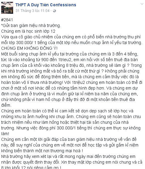 Chúng em cần một lời giải đáp của ban giám hiệu nhà trường về vấn đề này, để suy nghĩ của chúng em về một nơi để học tập và gửi gắm kỉ niệm không biến thành một nơi thương mại hoá!