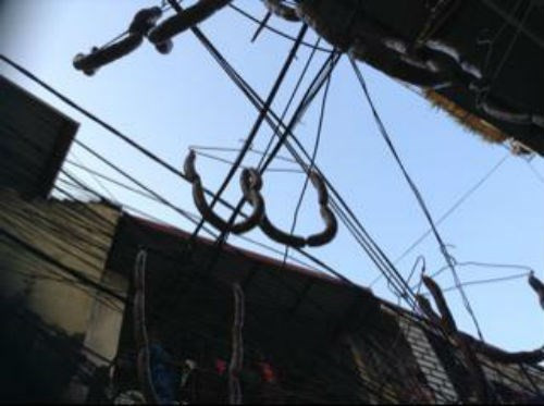 Tại khu vực ngõ 58, đường Hoàng Hoa Thám,người chế biến móc từng khúc lạp xưởng vào móc áo rồi đem treo trên...dây điện để phơi khô.