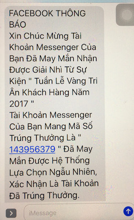 Chị M làm theo các bước hướng dẫn. Khoảng 2 tuần sau, chị M nhận được tin nhắn từ số điện thoại lạ với nội dung thông báo đã may mắn nhận được giải nhì từ sự kiện “Tuần lễ vàng tri ân khách hàng” năm 2017 và cung cấp mã số trúng thưởng là 143956379.